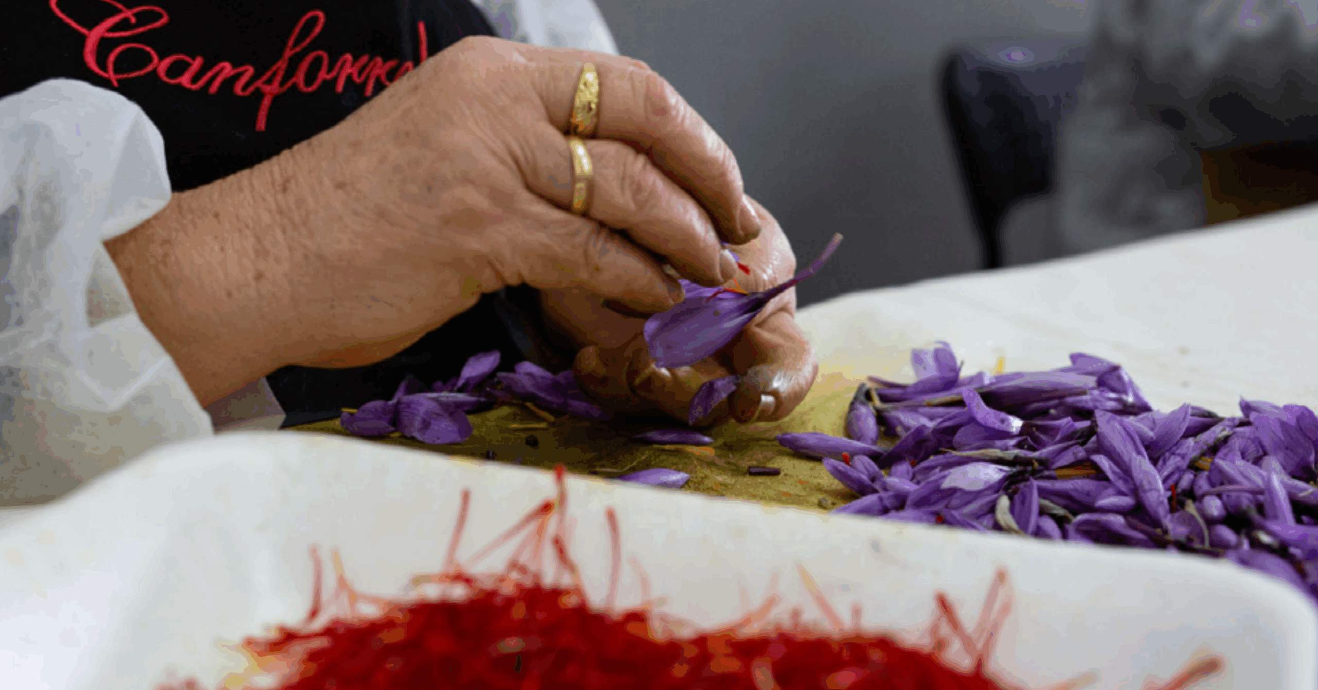 This process consists of manually removing the three stigmas from the rest of the flower, though keeping them joined at the base by a small pale-yellow piece of the style that remains. The harvested stigmas are placed into a container until the next stage: dehydration (image 3).